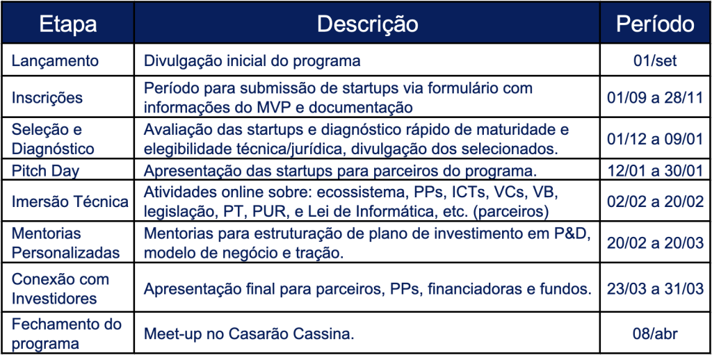 • Interação semanal com o ecossistema: encontros periódicos com representantes de ICTs, investidores, incubadoras, programas prioritários, corporações e gestores públicos, promovendo troca de experiências, networking e construção de oportunidades reais de negócio.
